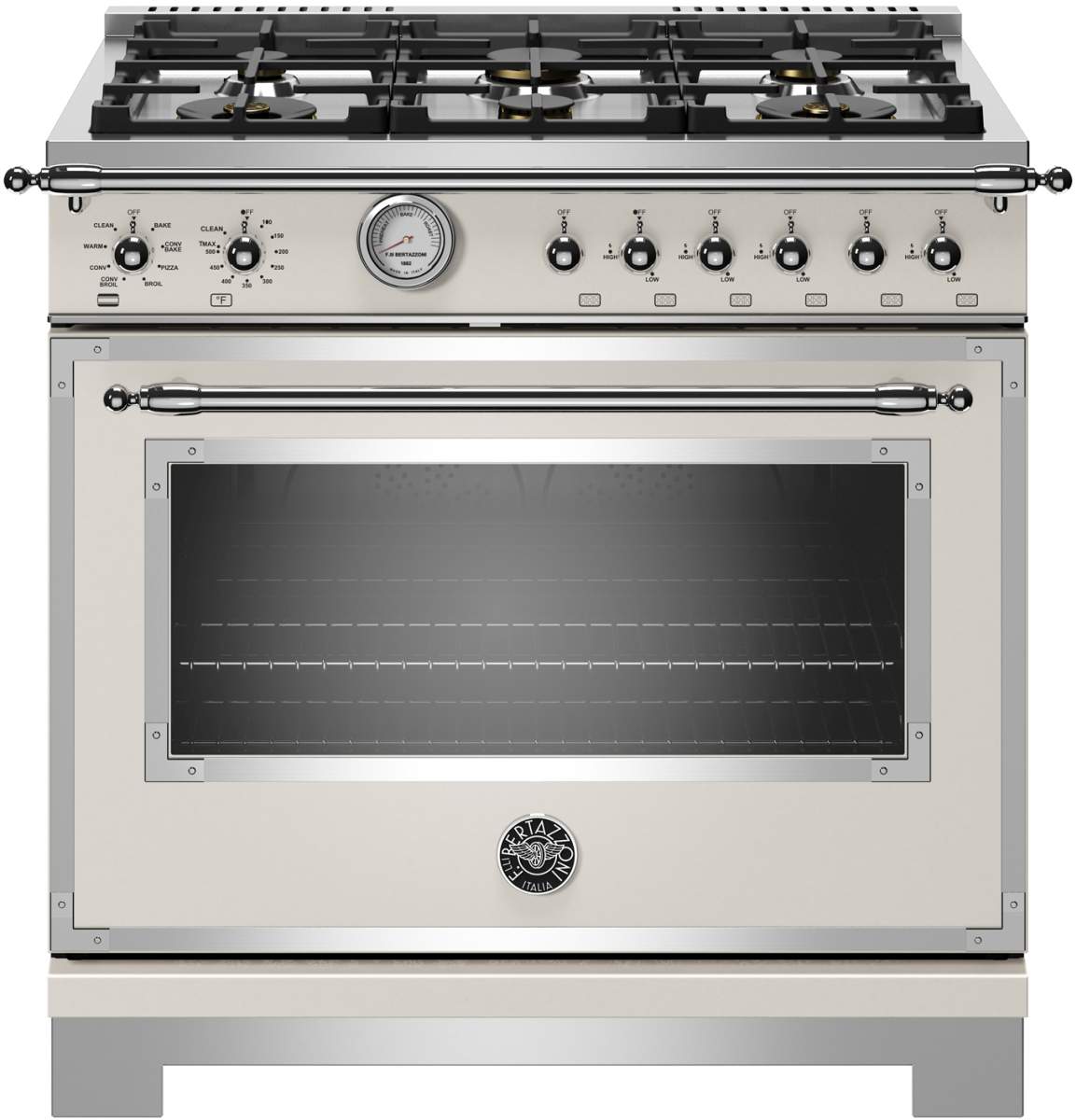 The new Bertazzoni ranges are superb cooking appliances designed, engineered and made in Italy. All Bertazzoni appliances integrate seamlessly into style-harmonized suites for a true, high-performing kitchen. The high-efficiency maintop with 6 brass burners features 2 dual ring 19,000 BTU power-burners that boil water in under 6 minutes (best in class), and 4 additional MonoBloc burners of variable size and power to suit every style of cooking, with delicate simmer at 750 BTUs. The 5.9 cubic feet oven cavity is the largest in its class, with dual convection fan for balanced airflow and even temperature baking and roasting on 7 shelf levels. The elegant large temperature gauge monitors the actual temperature in the oven. The extra wide infrared gas broiler is ideal for grilling and searing at high heat. The oven includes convenient features such as smooth telescopic glides for the oven shelves and soft-close doors. The edge-to-edge interior oven glass door maximizes interior volume and can be wiped clean without effort. All Bertazzoni appliances are covered by a 2-year warranty. Products and packaging are 99% recyclable.