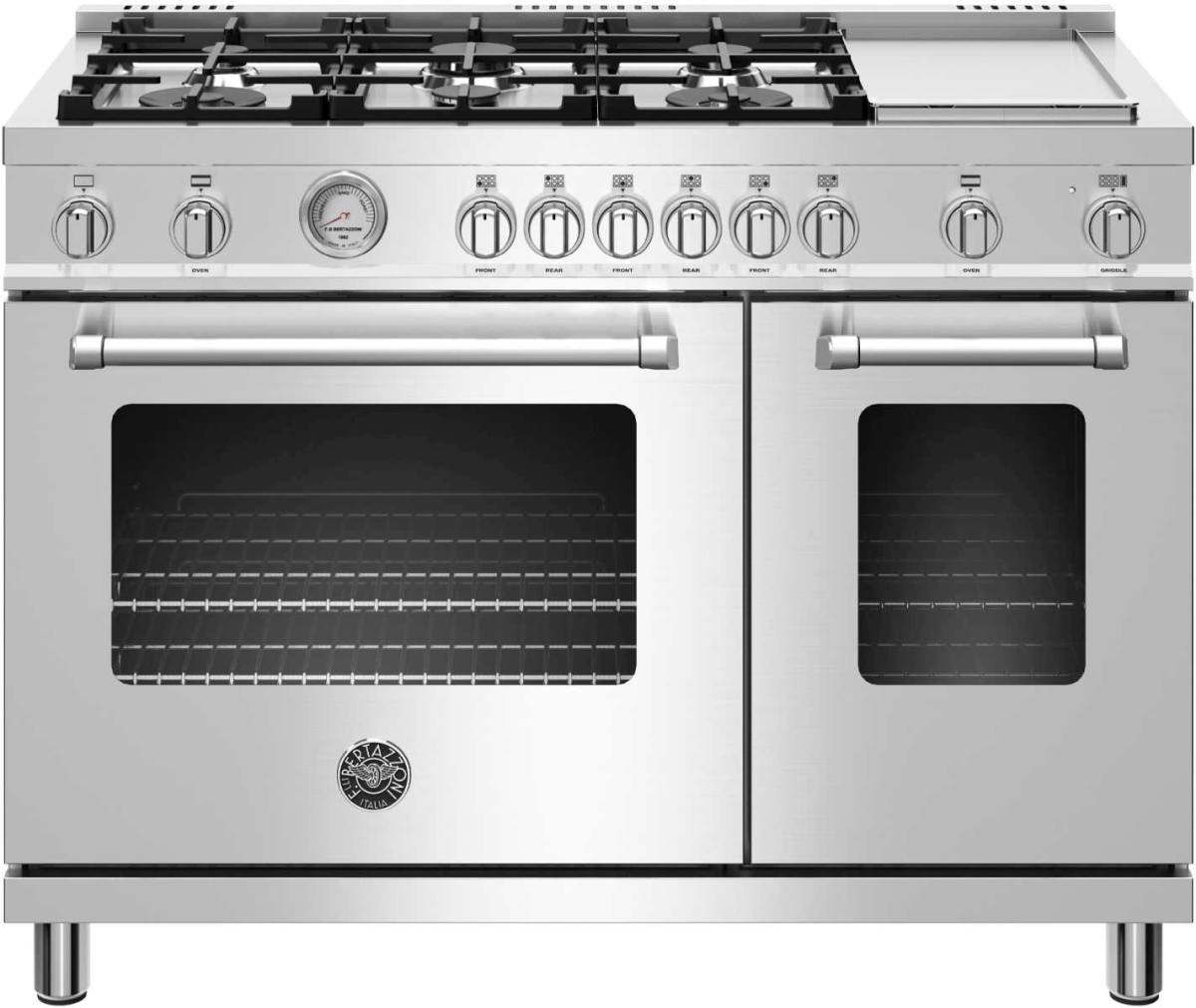The new Bertazzoni ranges are superb cooking appliances designed, engineered and made in Italy. All Bertazzoni appliances integrate seamlessly into style-harmonized suites for a true, high-performing kitchen. The high-efficiency maintop with 6 burners and electric griddle features 2 dual ring 19,000 BTU power-burners that boil water in under 6 minutes (best in class), and 4 additional MonoBloc burners of variable size and power to suit every style of cooking, with delicate simmer at 750 BTUs. The stainless steel griddle with integrated cover provides additional cooking options. The 4.8 cubic feet main oven cavity is the largest in its class, with dual convection fan for balanced airflow and even temperature baking and roasting on 7 shelf levels. The elegant large temperature gauge monitors the actual temperature in the oven. The extra wide infrared gas broiler is ideal for grilling and searing at high heat. The 2.4 cubic feet auxiliary oven is perfect for smaller dishes and for warming. Both ovens include convenient soft-motion doors. The edge-to-edge interior oven glass door maximizes interior volume and can be wiped clean without effort. All Bertazzoni appliances are covered by a 2-year warranty. Products and packaging are 99% recyclable.
