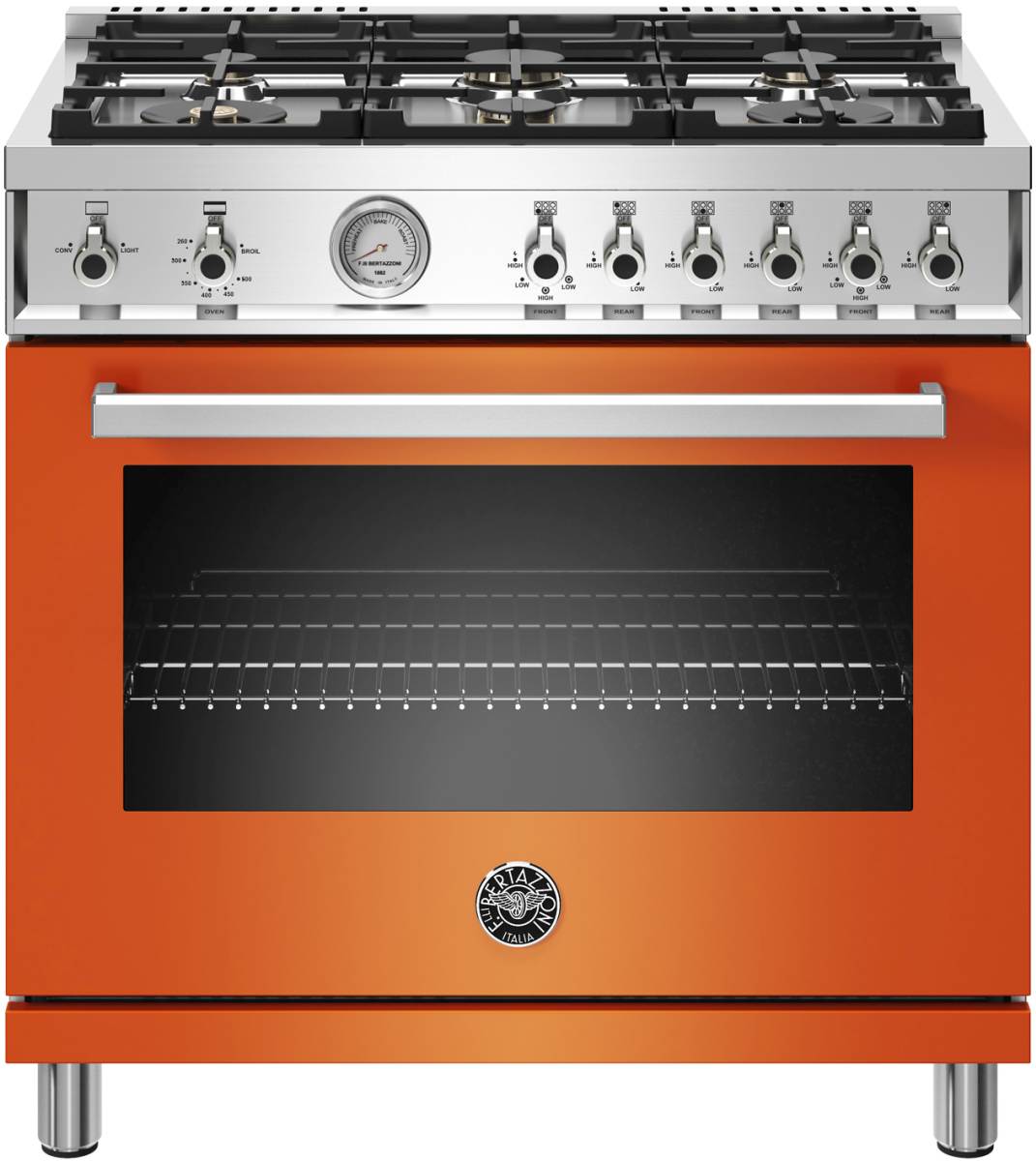 The new Bertazzoni ranges are superb cooking appliances designed, engineered and made in Italy. All Bertazzoni appliances integrate seamlessly into style-harmonized suites for a true, high-performing kitchen. The high-efficiency maintop with 6 brass burners features 2 dual ring 19,000 BTU power-burners that boil water in under 6 minutes (best in class), and 4 additional MonoBloc burners of variable size and power to suit every style of cooking, with delicate simmer at 750 BTUs. The 5.9 cubic feet oven cavity is the largest in its class, with dual convection fan for balanced airflow and even temperature baking and roasting on 7 shelf levels. The elegant large temperature gauge monitors the actual temperature in the oven. The extra wide infrared gas broiler is ideal for grilling and searing at high heat. The oven includes convenient features such as smooth telescopic glides for the oven shelves and soft-close doors. The edge-to-edge interior oven glass door maximizes interior volume and can be wiped clean without effort. All Bertazzoni appliances are covered by a 2-year warranty. Products and packaging are 99% recyclable
