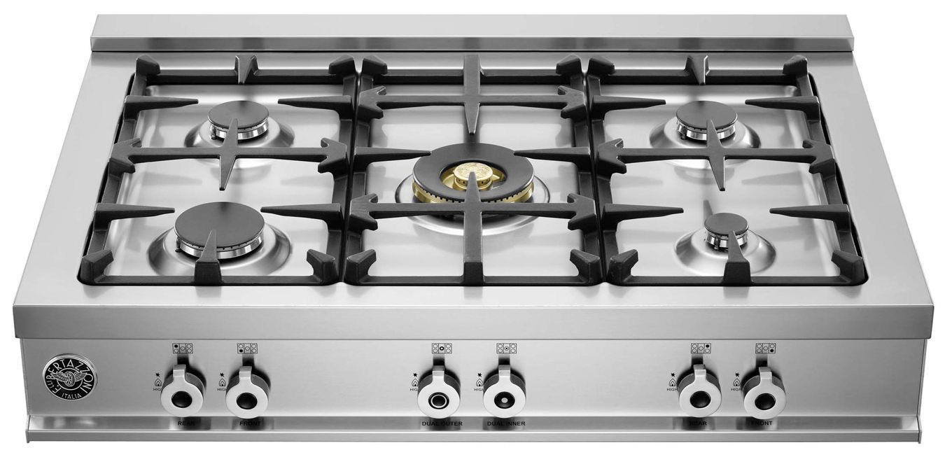 Bertazzoni rangetops and cooktops are superb cooking appliances designed, engineered and made in Italy. All Bertazzoni appliances integrate seamlessly into style-harmonized suites for a true, high-performing kitchen. Available in 5 and 6 burner configurations, Bertazzoni gas rangetops signature maintops are crafted from a single sheet of highest grade stainless steel. This proprietary design makes it very easy to clean. The dual-ring power-burner rated is at 18,000 BTUs, boiling water in under 6 minutes and simmering at an extremely low temperature. All burners are made from cast brass for enhanced performance. All Bertazzoni appliances are covered by a 2-year warranty. Products and packaging are 99% recyclable.