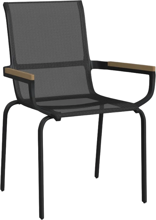 Fade-resistant black mesh provides comfortable support, while eucalyptus wood arms add a natural touch that withstands the elements. This mixed-material design makes for a striking addition to any outdoor space and easily stacks for tidy storage.
