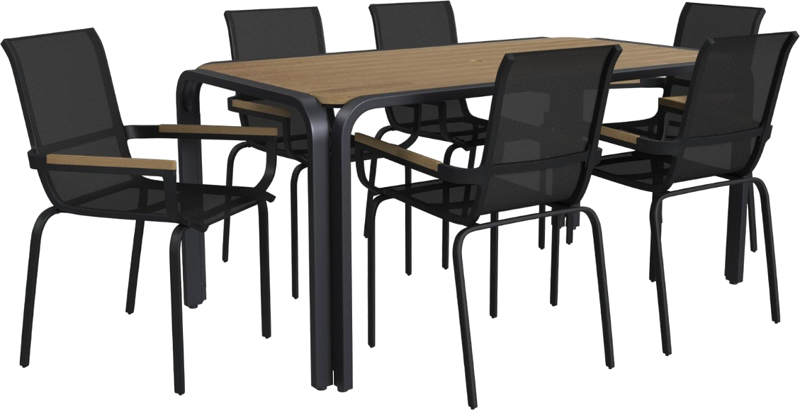 Elevate your outdoor entertaining with a laid-back, luxe look. Offering ample space for sharing meals with up to six people, the Finn 7-piece outdoor dining set is crafted with a lightweight yet sturdy recycled black aluminum frame, durable eucalyptus wood that offers exceptional resistance against the elements, and fade-resistant black mesh seats. This two-tone, mixed-material design makes for a striking addition to any outdoor space.Read More