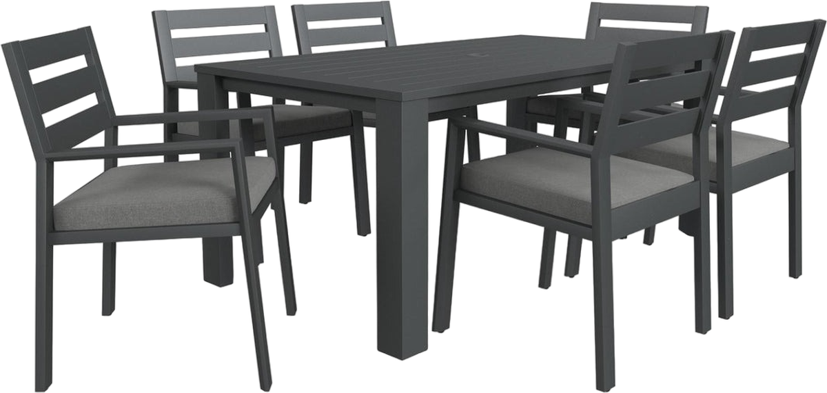 Outdoor spaces become a place to gather and eat when you add a Homestyles Grayton Outdoor 7-Piece Dining Set. This set includes a rectangular dining table and six chairs. The slatted table top prevents water from pooling, and the comfy chair cushions provide enjoyable comfort. The durable recycled aluminum frame makes this a dining set for all seasons, year after year.Read More