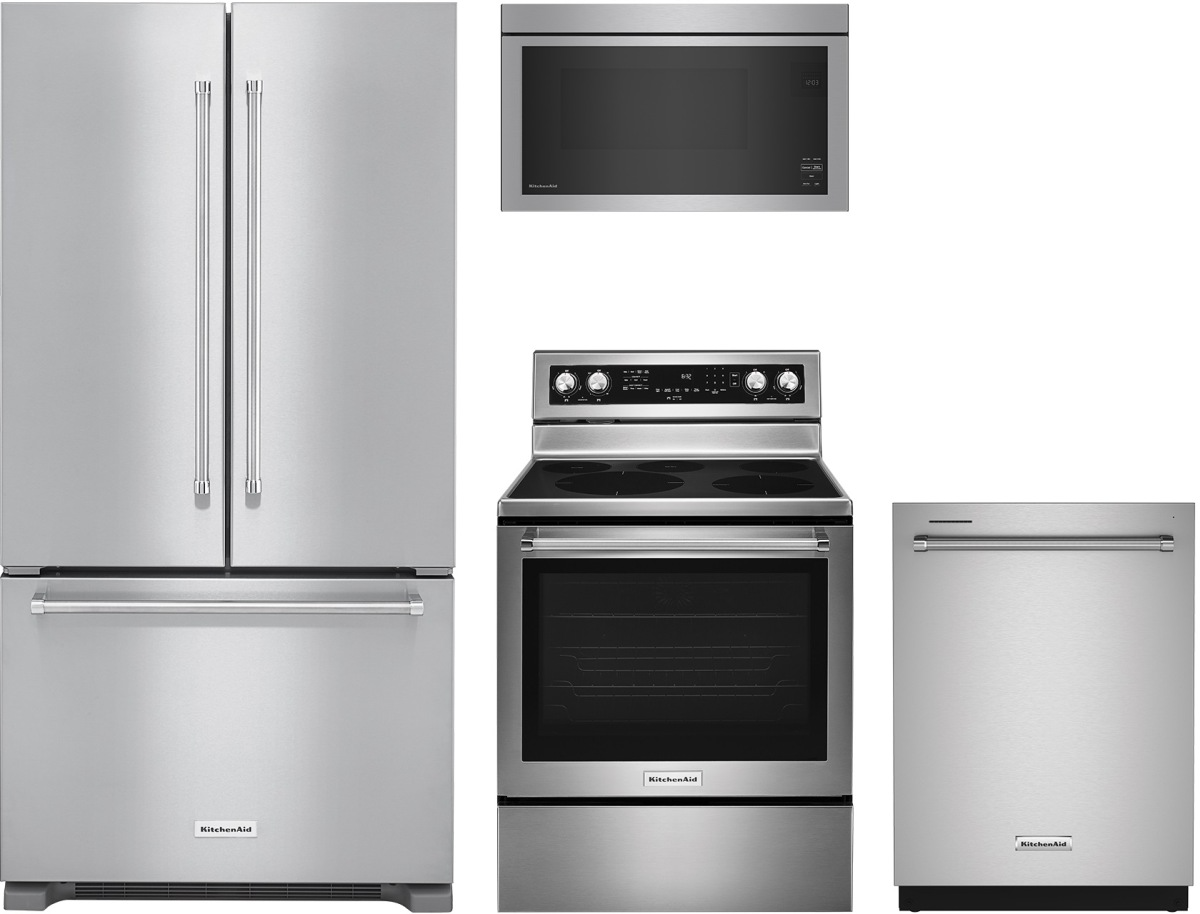 KitchenAid® 4 Piece Stainless Steel Kitchen Package with a French door refrigerator, free standing electric range, over the range microwave and built in dishwasher.Read More
