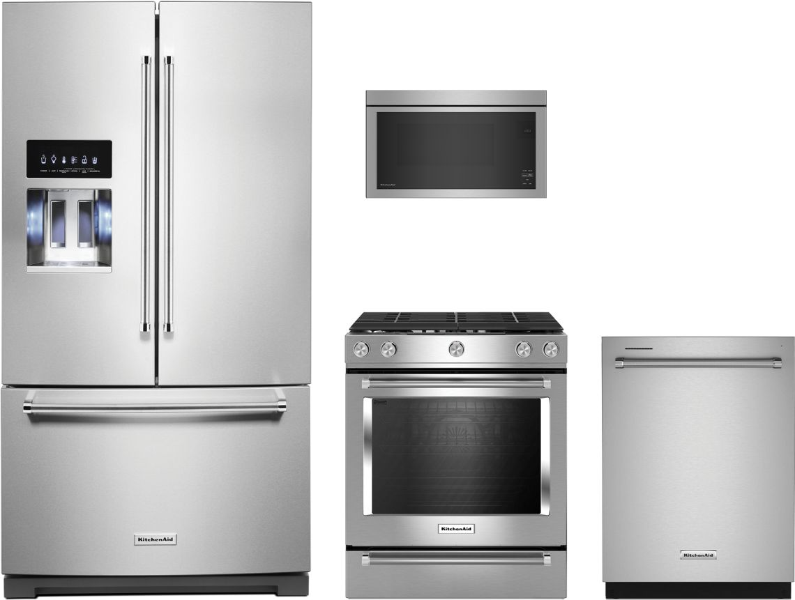 KitchenAid® 4 Piece Stainless Steel Kitchen Package with a French door refrigerator, slide in gas range, over the range microwave and built in dishwasher.Read More