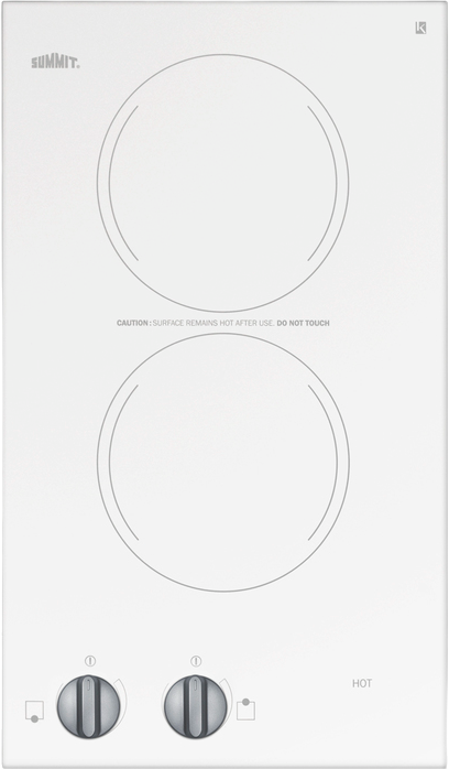 Summit's selection of European cooktops includes popular radiant choices ideal for every kitchen space. Model CR2220WHE is a 2-burner 220-240V electric cooktop conveniently sized at 12" wide. Made with EuroKera ceramic glass, the CR2220WHE offers modern style and convenience with an easy-to-clean white cooking surface. Two 1200W radiant elements feature a 6" diameter, manufactured by E.G.O. of Germany.Read More