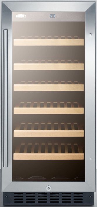 Give your wine collection the proper care with SUMMIT SWC1535B, a slim-fitting wine cellar designed for built-in use under counters. At just 14.75" wide, the SWC1535B is thoughtfully sized to store up to 33 Bordeaux style bottles on six slide-out wooden shelves (if using this unit for wider Burgundy style bottles, you can remove every other shelf to accommodate their size). An interior LED light provides an elegant view behind a tempered glass door, elegantly trimmed in stainless steel. The reversible door includes a factory installed lock and professional handle. Inside, the digital thermostat makes temperature management easy and intuitive, with indicator lights to show when the interior is ideal for reds, whites, and sparkling wines. The SWC1535B has a jet black cabinet and flush back design for easy installation under any counter. The unit can be used built-in or freestanding. For a matching glass door beverage refrigerator, see the SCR1536B. This model replaces SUMMIT SWC1535.