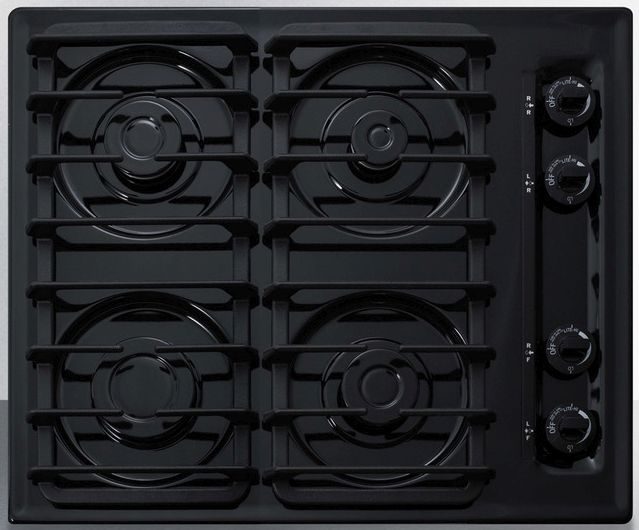 The TTL033S is a 24" wide 4-burner cooktop designed for 22 5/8" W x 18 5/8" D cutouts. The scratch-resistant porcelain surface features a jet black finish and recessed design to better contain spills. The side-located push-to-turn dial knobs offer easy use. Two sets of continuous cast iron grates are designed to hold up to heavy pots and pans.