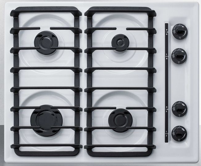 The WTL033S is a 24" wide 4-burner cooktop designed for 22 5/8" W x 18 5/8" D cutouts. The scratch-resistant porcelain surface features a classic white finish and recessed design to better contain spills. The side-located push-to-turn dial knobs offer easy use. Two sets of continuous cast iron grates are designed to hold up to heavy pots and pans.