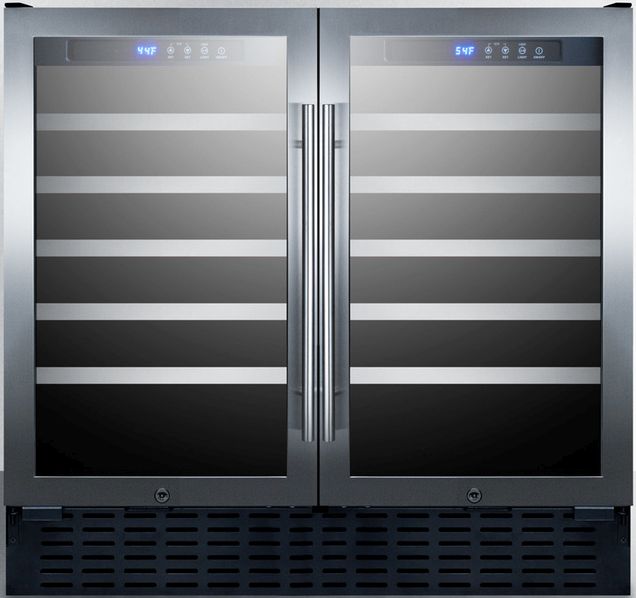 SUMMIT's collection of built-in undercounter wine cellars offers quality storage with user-friendly convenience and elegant style. At just under 32" high and 36" wide, the SWC3668ADA wine cellar is designed for built-in installation under lower ADA compliant counters. The fully finished black cabinet also allows freestanding use. This unit includes two seamless stainless steel trimmed glass doors with a unique French door swing. Both include factory installed locks for added security and professional handles to finish the modern look. Two separate zones feature independent digital thermostats, letting you chill white and sparkling wine in one section while preserving reds under warmer temperatures in the other. Both zones include five wooden shelves in a jet black finish with stainless steel trim, as well as slotted floors to accommodate champagne bottles. The interior can store up to 68 standard 750ml Bordeaux bottles. Alternatively, you can fit up to 56 wider "Burgundy" style bottles (often used for Chardonnay and Pinot Noir). Recessed LED lighting offers an attractive view to let you display your wine collection in style. With a professional look and innovative design, SUMMIT SWC3668ADA is a unique addition to any home.